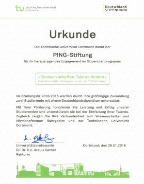 Im Jahr 2015 hat die PING-Stiftung im Rahmen des Deutschlandstipendium zwei Stipendien über die gesamte Regelstudienzeit des Studiengangs Informatik (Bachelor) an der TU Dortmund ausgelobt.